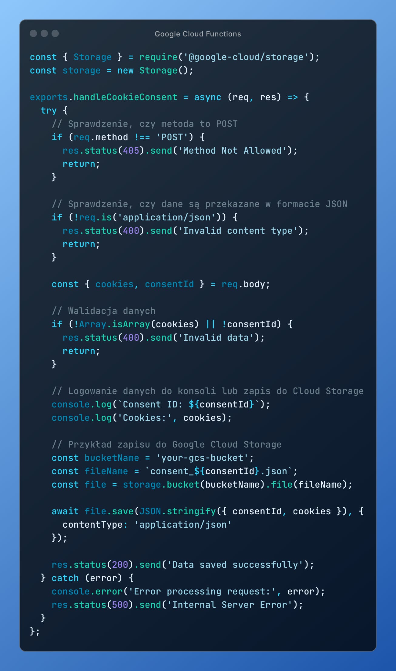 Następnie, w zręczny sposób jesteś w stanie do Google Tag Manager Server-Side przesyłać informacje o statusie konkretnej zgody, a potem przechowywać to w Google Cloud Functions — na przykład tak: