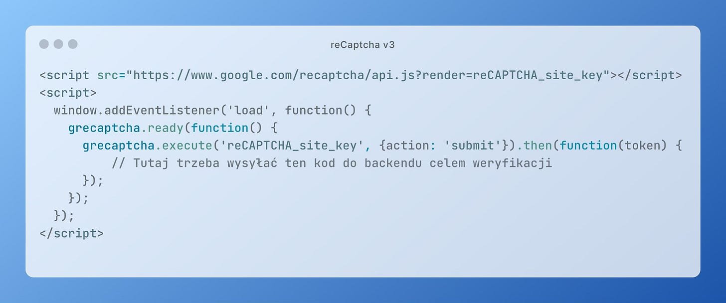 Google reCAPTCHA v3 — przykład podstawy systemu weryfikacji niejakościowego ruchu.