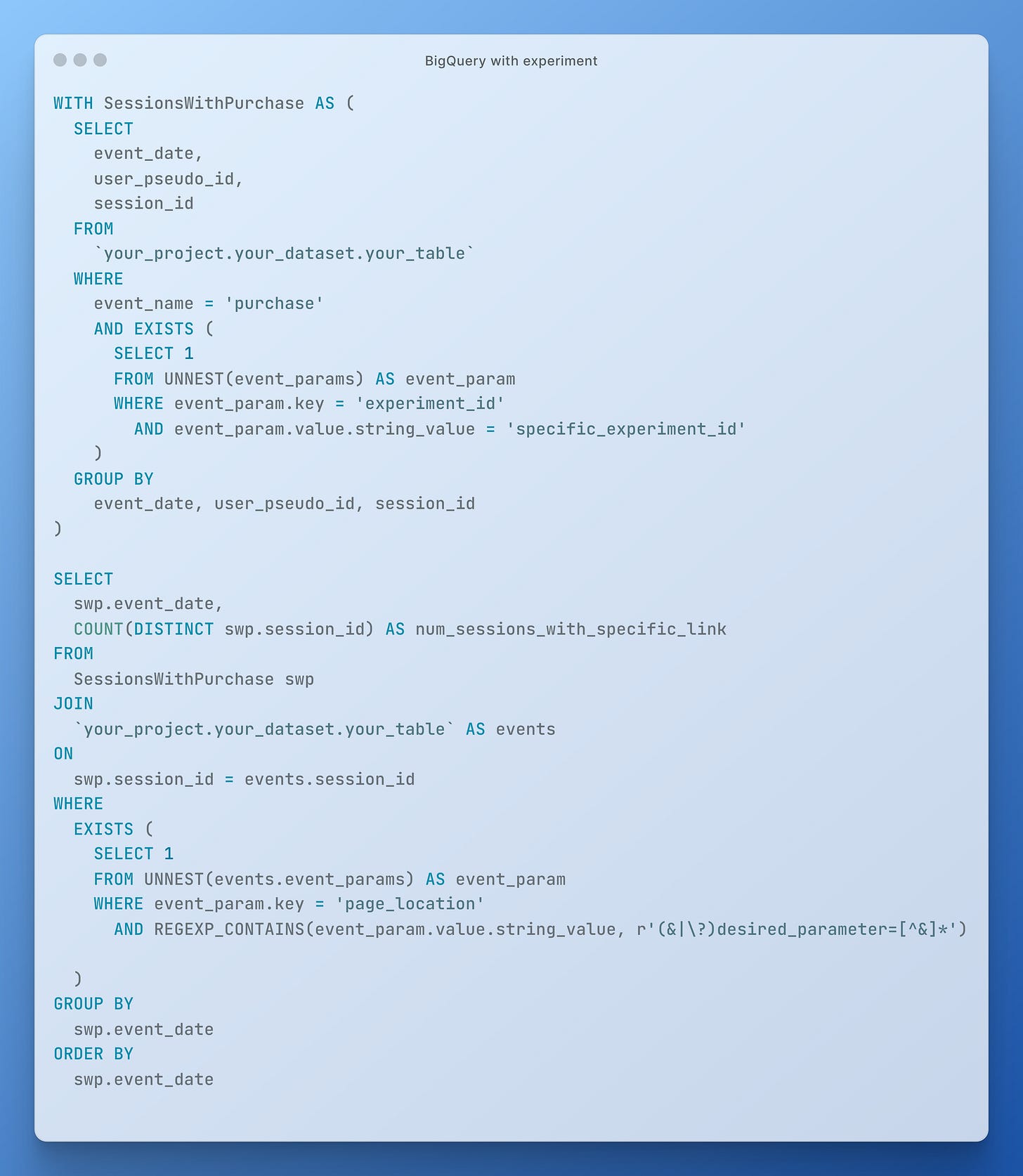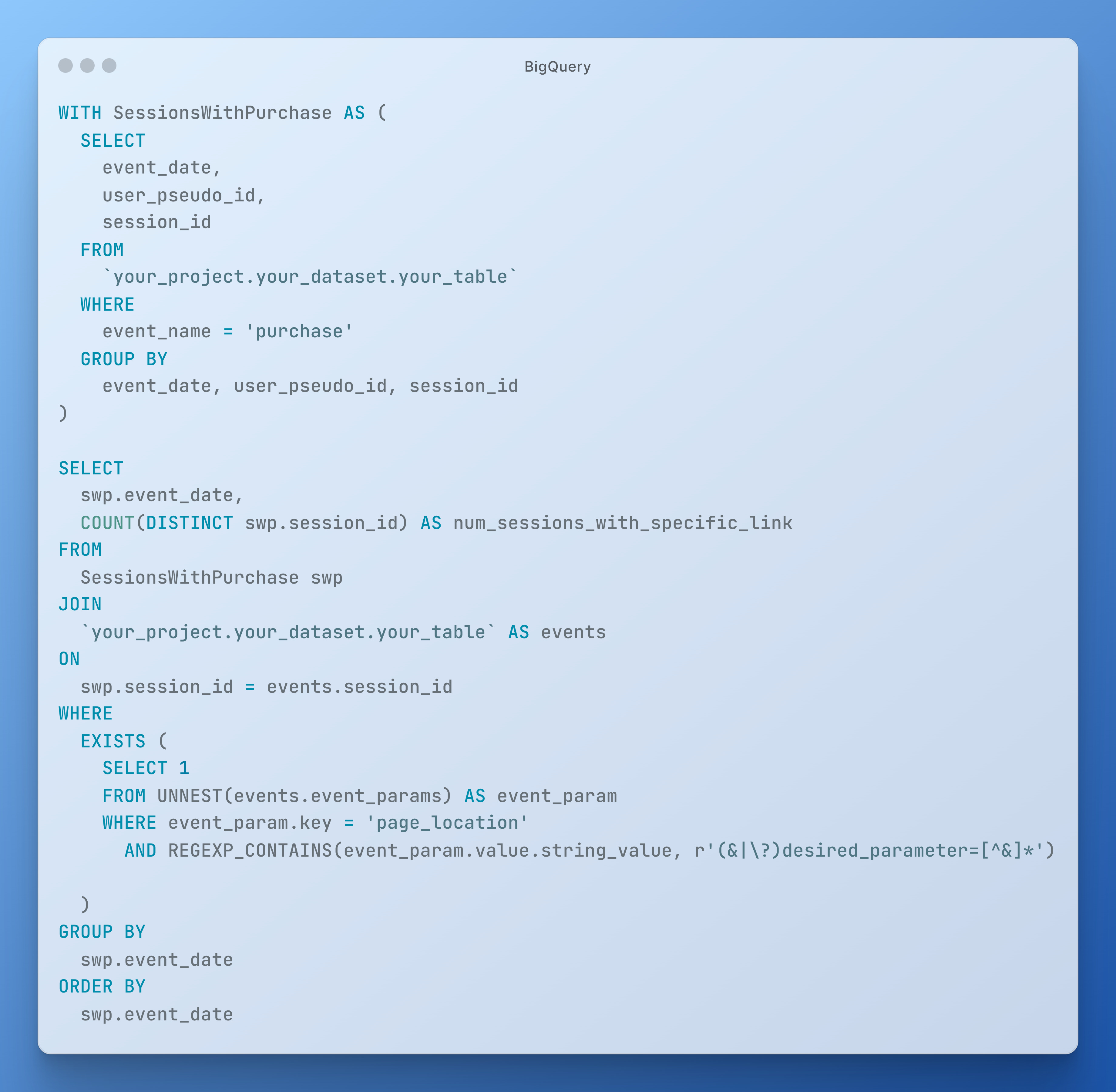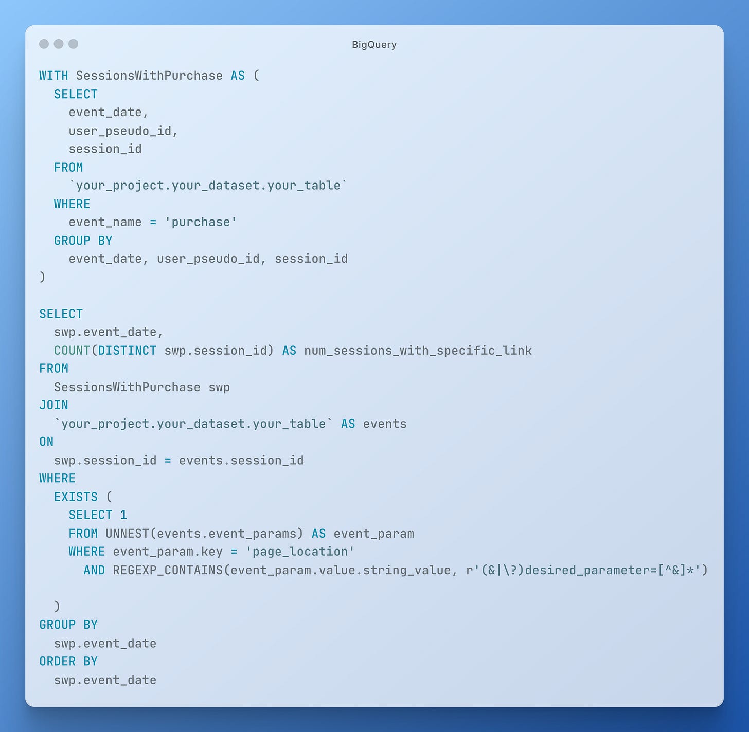 Drugi krok można zrealizować poprzez chociażby wykrywanie sesji, gdzie pojawiało się zdarzenie purchase i link z parametrem, który dokleił system MA — przykład poniżej:
